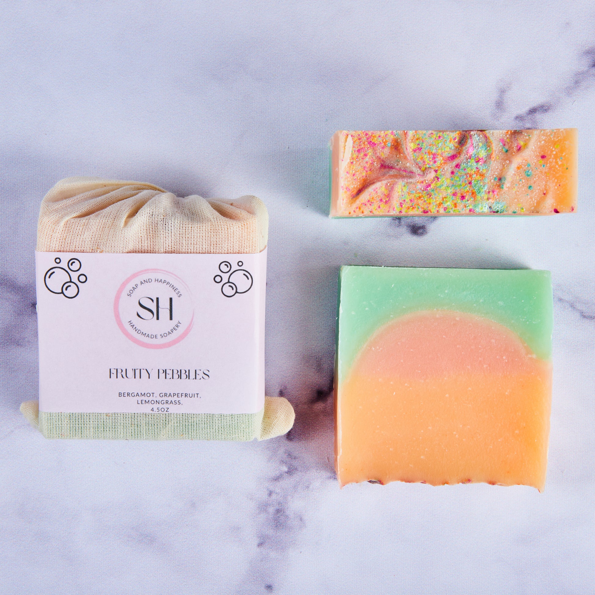 Fruity Pebbles are an all-natural soap bar made from the best quality plant-based ingredients and enriched with grapefruit, lemongrass, and bergamot essential oils, offering a fragrant and cleansing experience. These essential oils are carefully selected and blended for their natural antibacterial and astringent properties, providing a refreshing and invigorating wash.