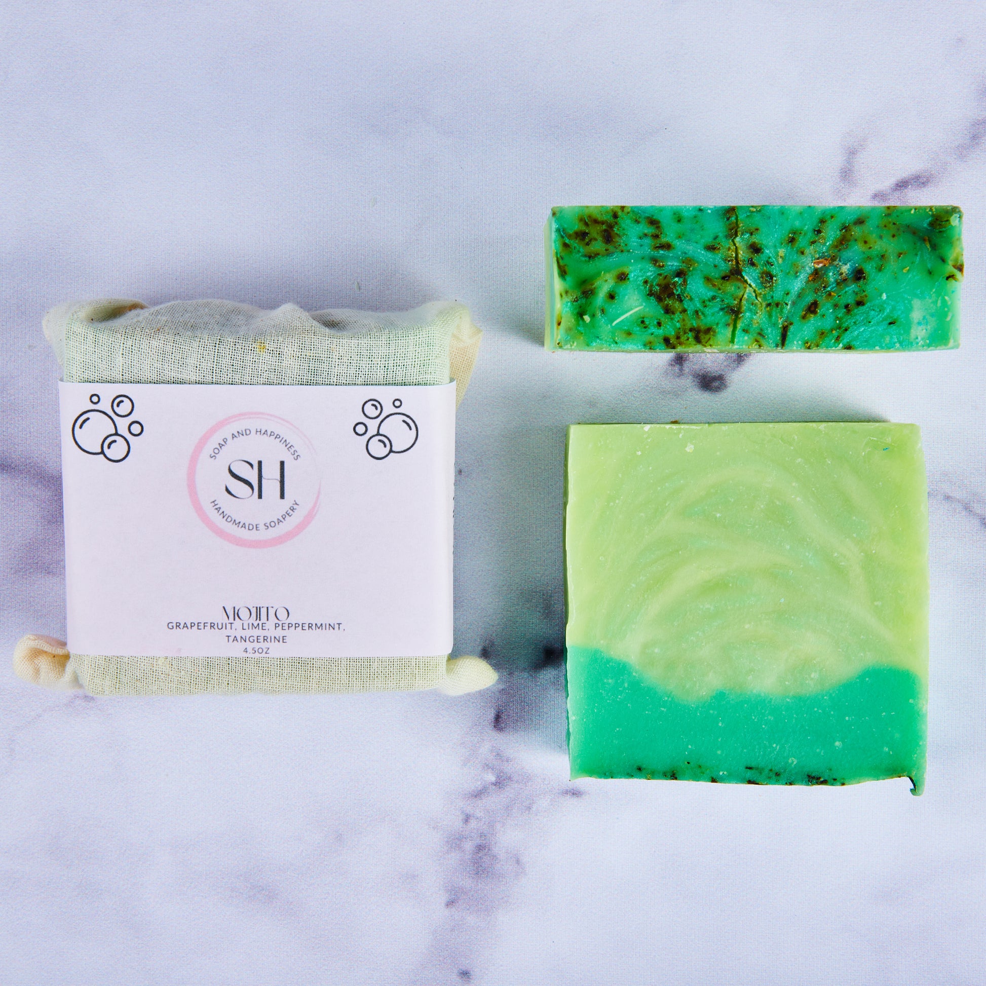 Our Mojito handmade soap is a bright and invigorating blend of essential oils, including lime, tangerine, grapefruit, and peppermint. Our soap is created with natural ingredients and is sure to leave your skin feeling soft and clean. Enjoy the natural cleansing and moisturizing benefits of this perfect summer scent.